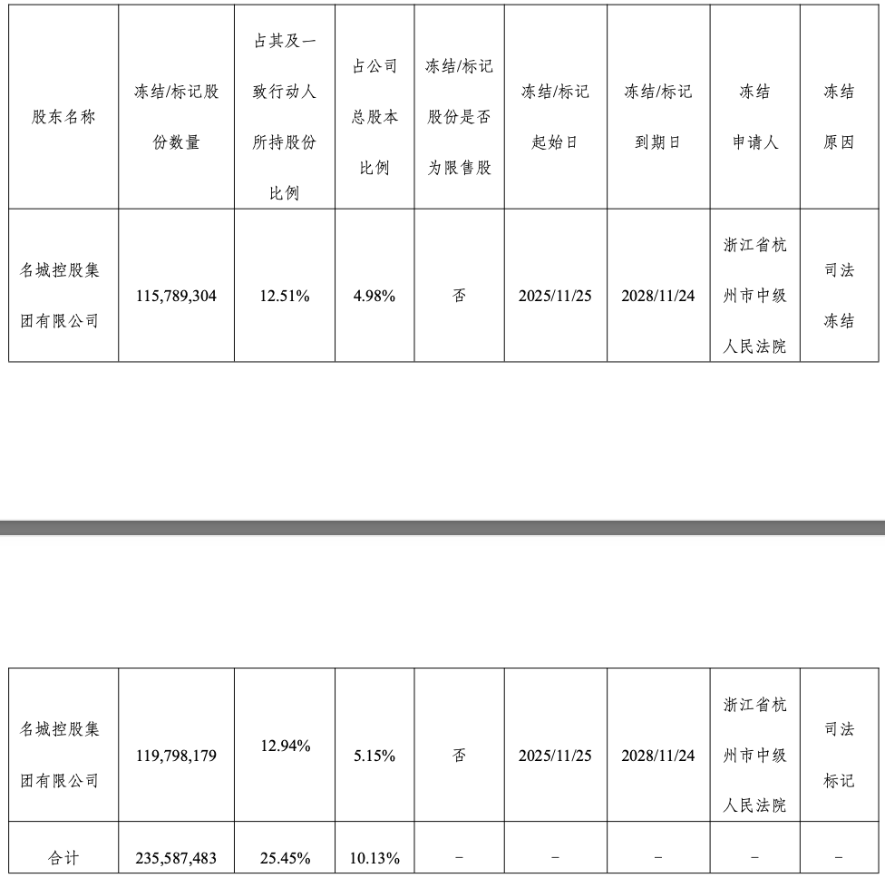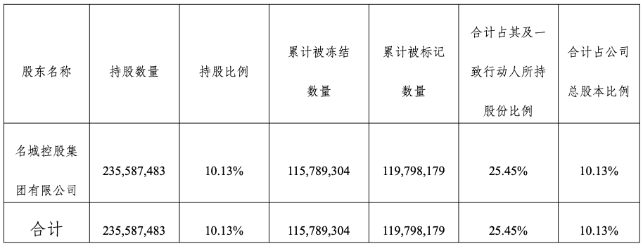 公告显示,名城控股集团有限公司及其一致行动人合计持有公司925,519,761股股份,占公司总股本的39.81%,截至本公告日,名城控股集团有限公司持有的公司股份被司法冻结115,789,304股、被司法标记119,798,179股,占公司总股本的10.13%。
