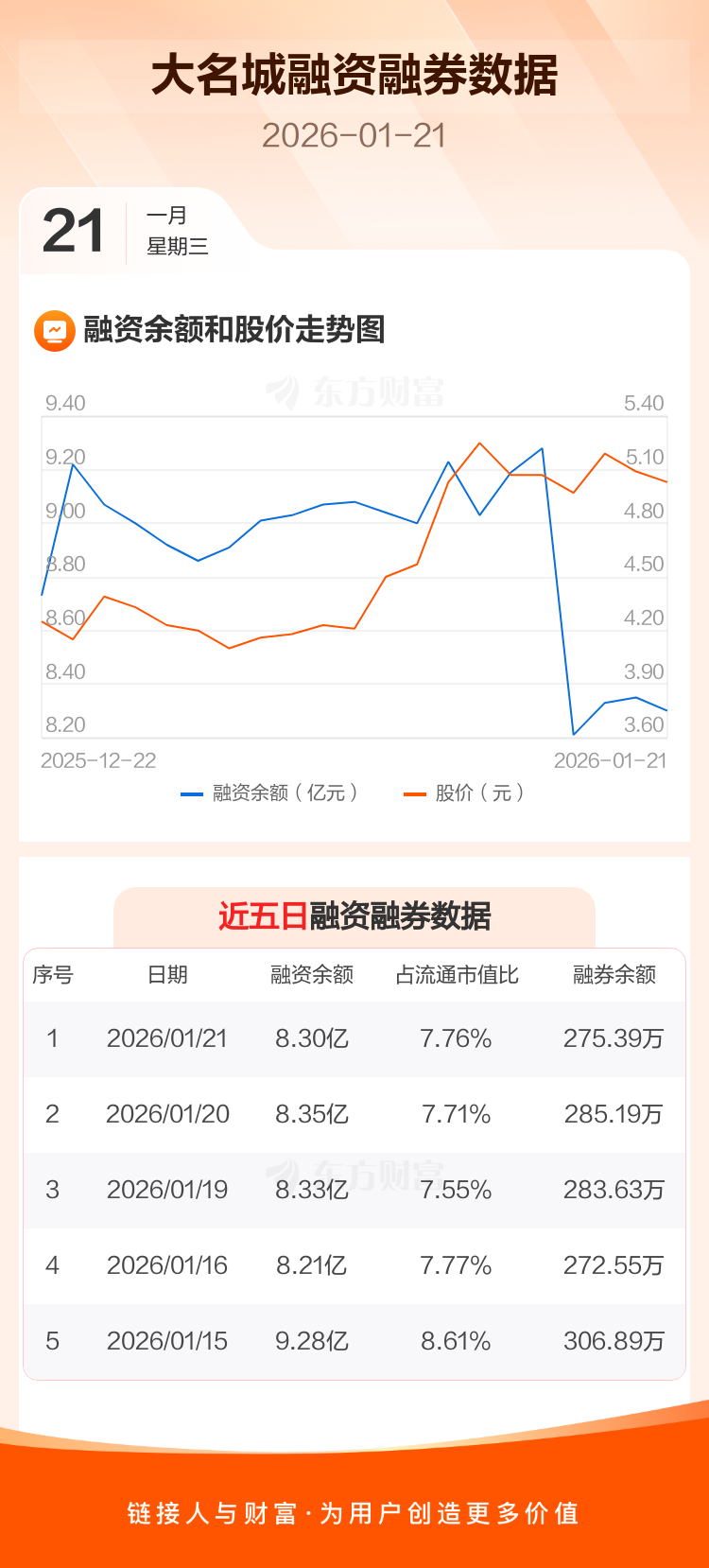 交易所最新数据显示,大名城于2026年1月21日获融资买入864.12万元,融资偿还1331.82万元,当日融资净偿还467.69万元。目前,该股融资余额8.30亿,占流通市值比例为7.76%。