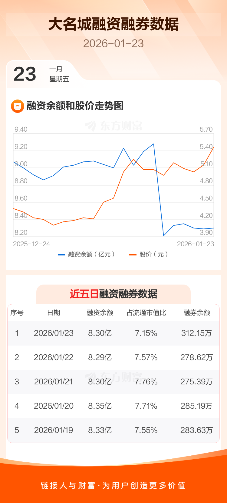 交易所最新数据显示,大名城于2026年1月23日获融资买入2627.10万元,融资偿还2568.75万元,当日融资净买入58.35万元。目前,该股融资余额8.30亿,占流通市值比例为7.15%。