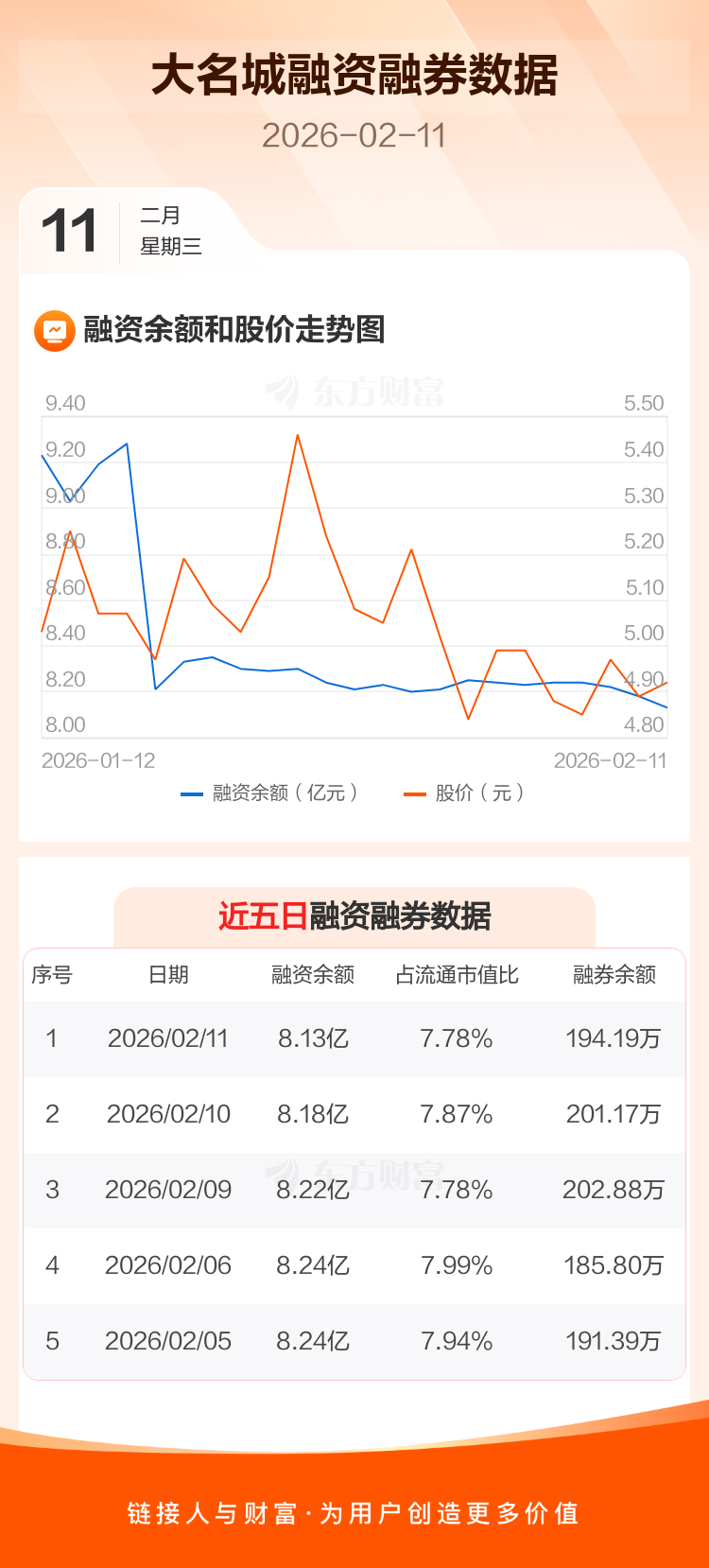 交易所最新数据显示,大名城于2026年2月11日获融资买入326.62万元,融资偿还777.13万元,当日融资净偿还450.51万元。目前,该股融资余额8.13亿,占流通市值比例为7.78%。
