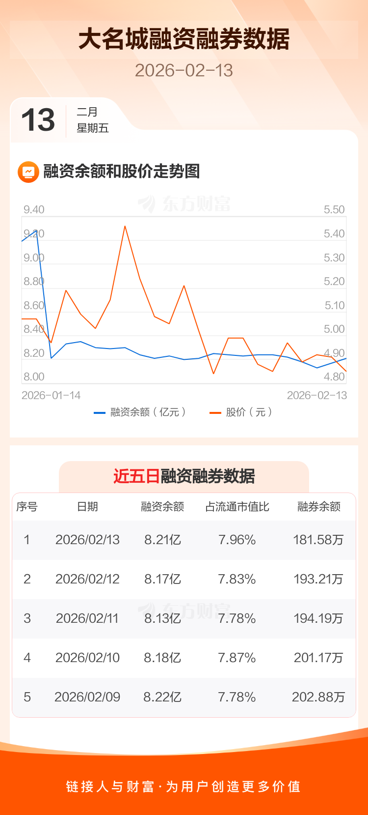 交易所最新数据显示,大名城于2026年2月13日获融资买入1044.15万元,融资偿还645.99万元,当日融资净买入398.15万元。目前,该股融资余额8.21亿,占流通市值比例为7.96%。