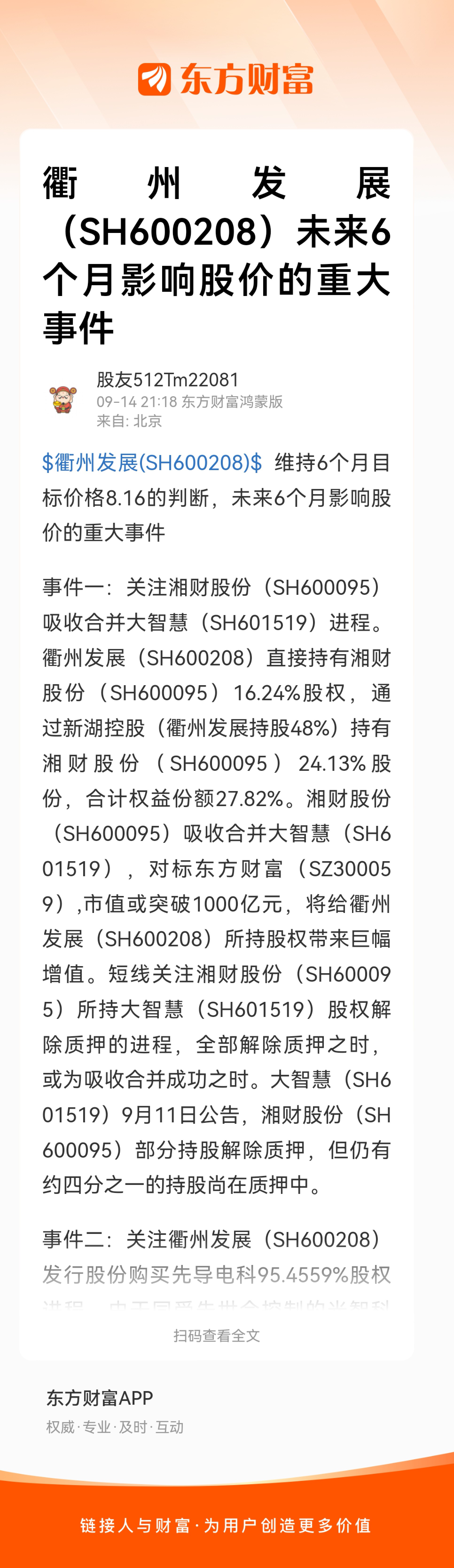 关注湘财股份吸收合并大智慧对其股东衢州发展的影响