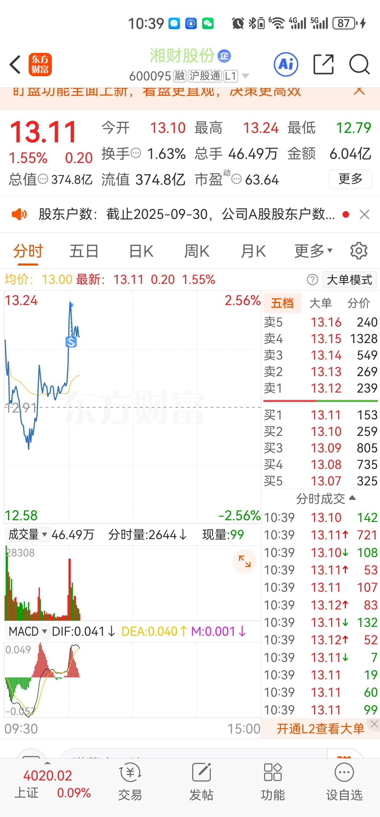 $湘财股份(SH600095)$ 等你一早上了终于掏上了,下来再接你