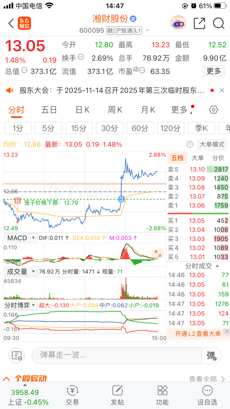 $湘财股份(SH600095)$ 收盘前或许还有一波,明天就开始强攻