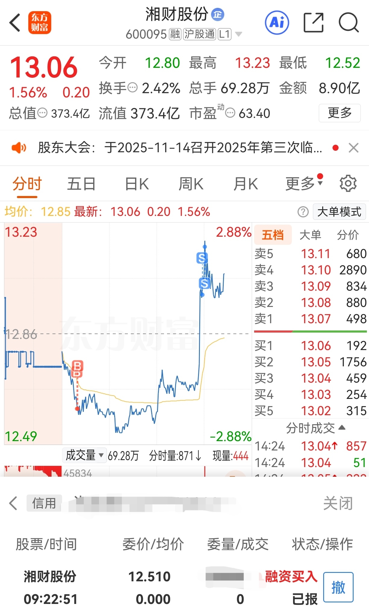 $湘财股份(SH600095)$ 气死我了,就不能再砸1分钱?预埋单差1分完美大T