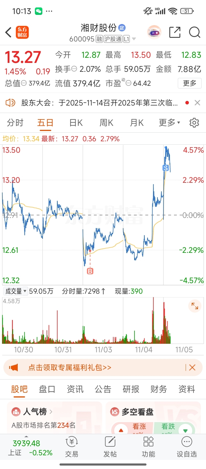 $湘财股份(SH600095)$ 落袋为安,我也减持了