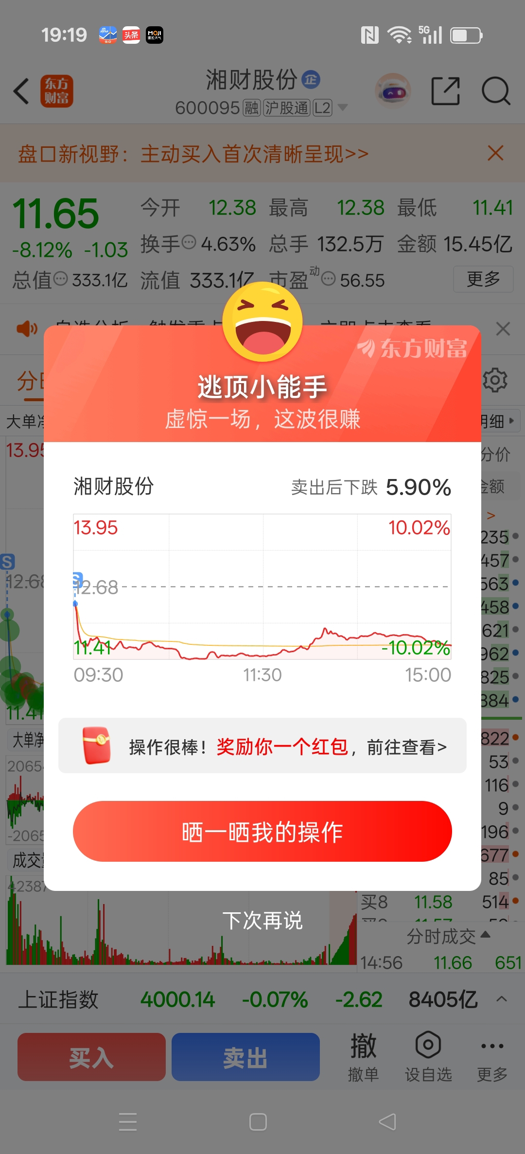 $湘财股份(SH600095)$ 昨晚看到消息,我直接挂跌停价出,卖在今天最高点