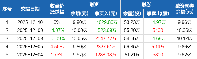 湘财股份融资融券信息显示,2025年12月10日融资净偿还1029.8万元;融资余额9.9亿元,较前一日下降1.03%。