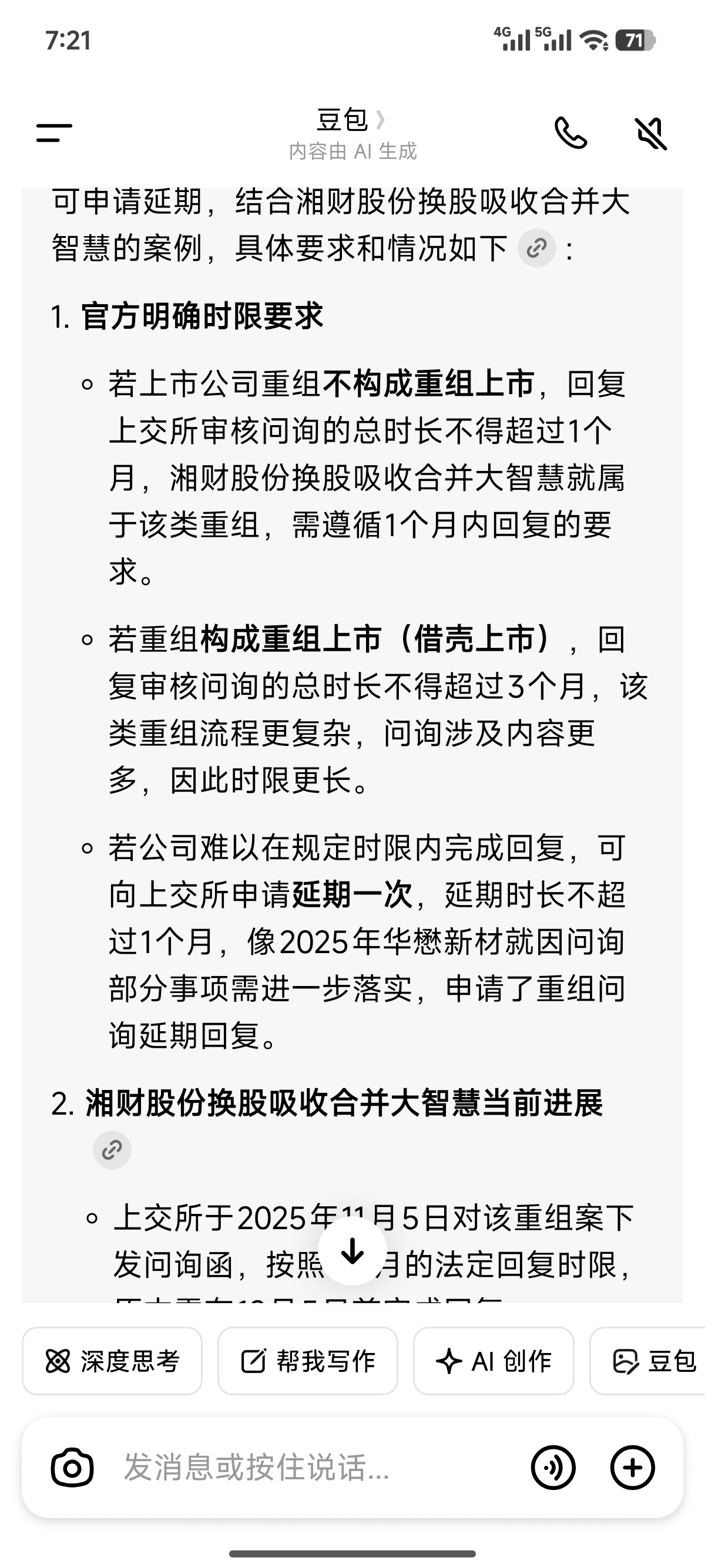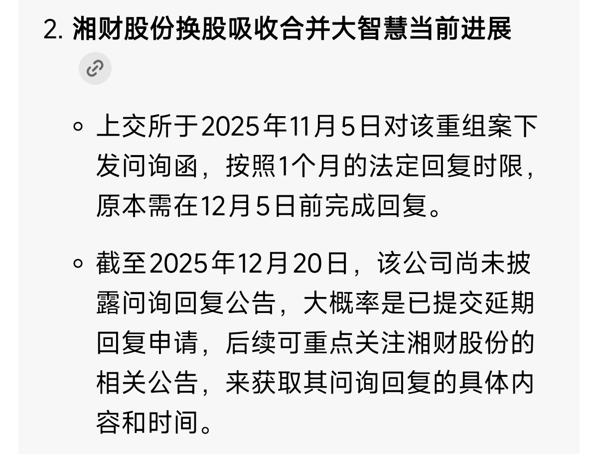 按程序,湘财不属于重组必须1个月回复,12月5号时间到了没回复也没公告延期,到底