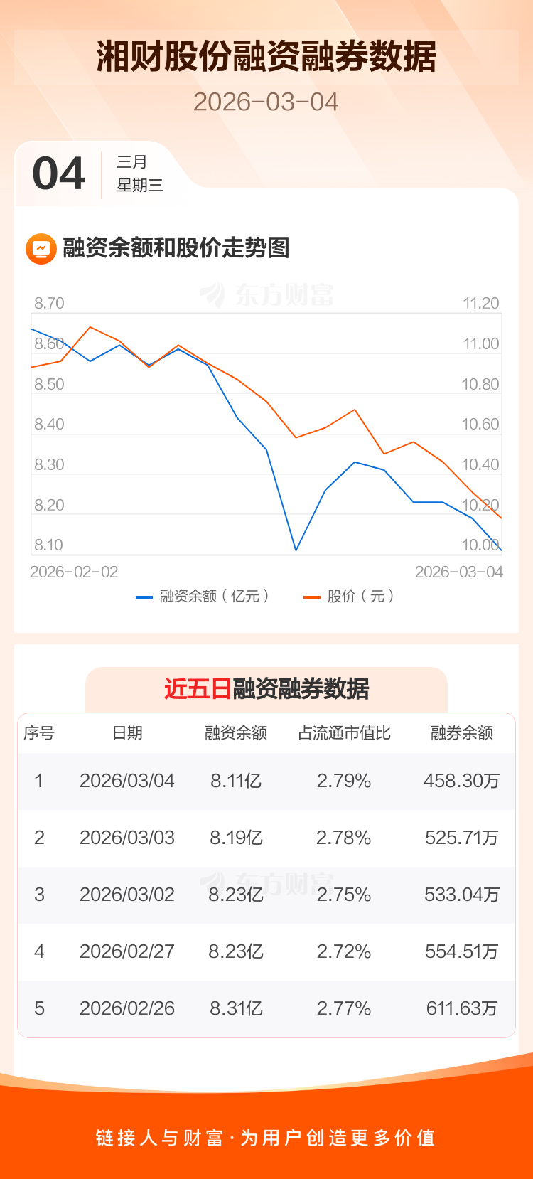 交易所最新数据显示,湘财股份于2026年3月4日获融资买入1428.39万元,融资偿还2227.10万元,当日融资净偿还798.72万元。目前,该股融资余额8.11亿,占流通市值比例为2.79%。