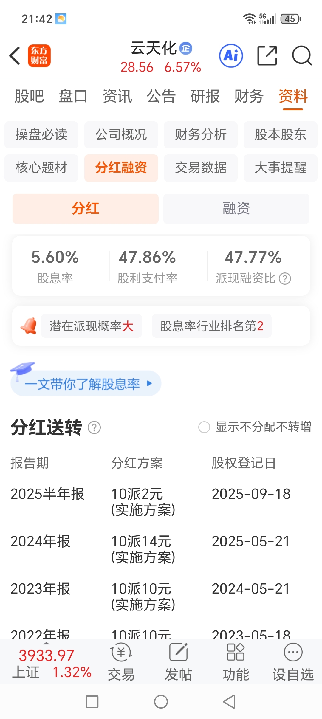 $云天化(SH600096)$ 高息资源股。股息率5.6%