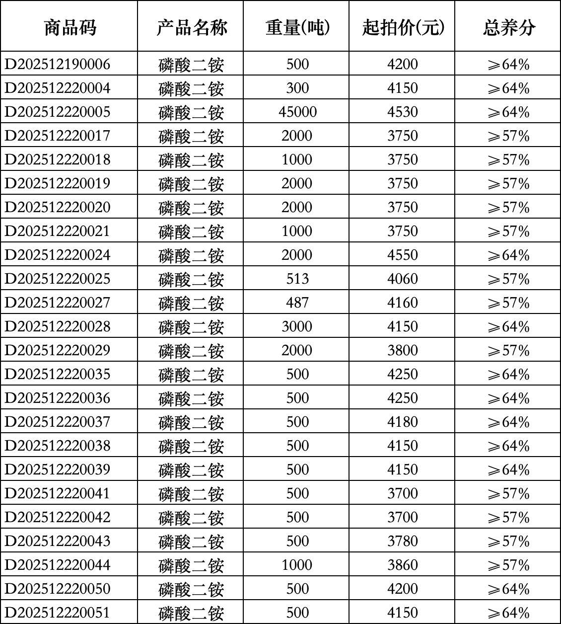 根据《国家化肥商业储备氮磷及复合肥建储采购竞拍交易办法》规定,现将12月23日氮磷及复合肥竞拍部分交易信息预告如下: