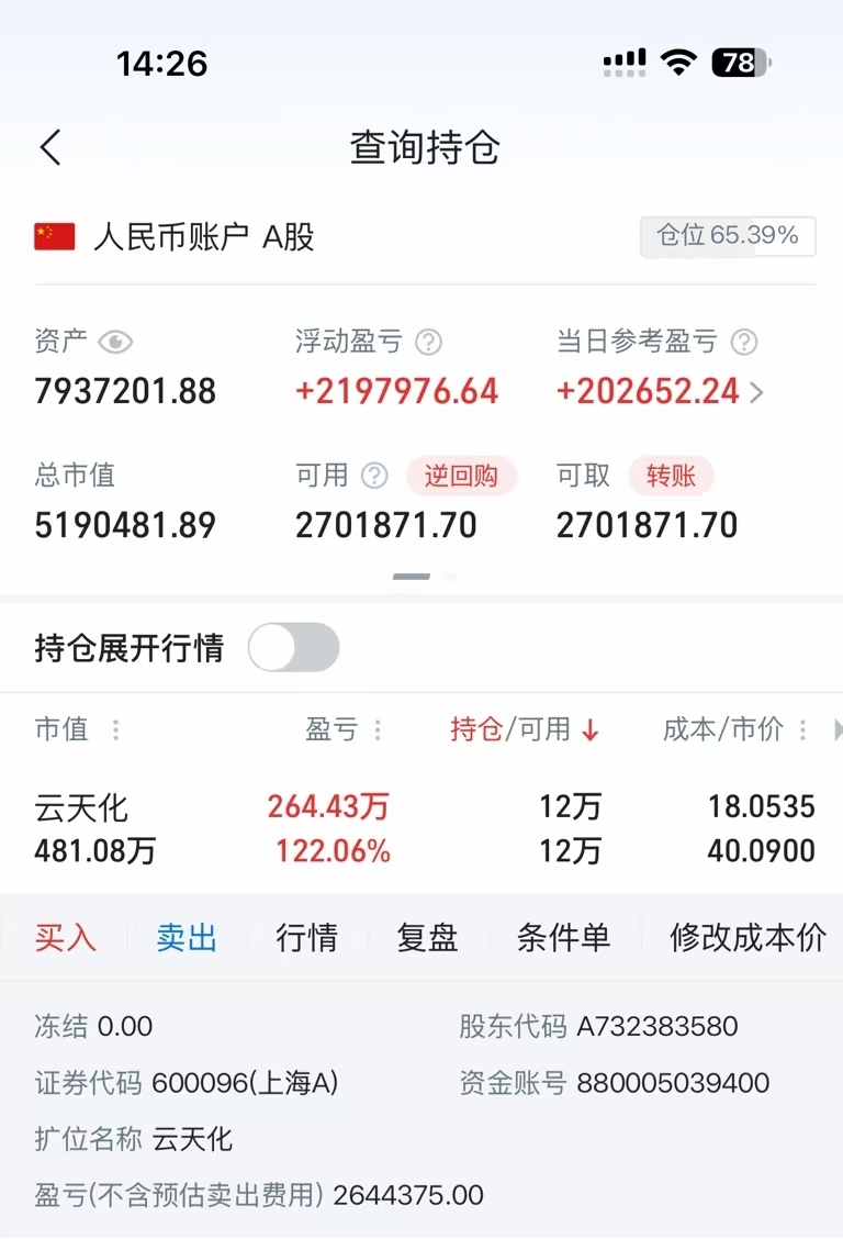 $云天化(SH600096)$ 还记得这个王,8吗,最高位钓鱼晒持仓