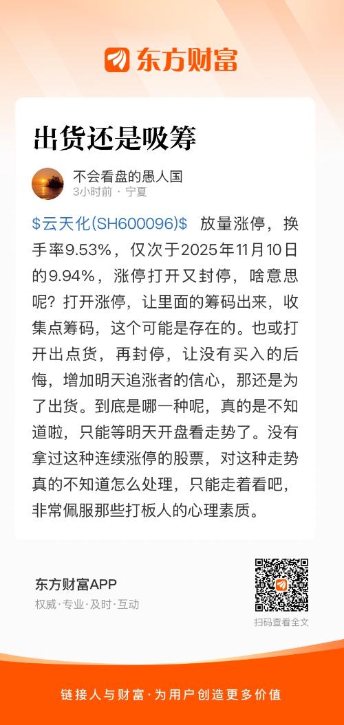 $云天化(SH600096)$ 放量涨停,换手率9.53%,仅次于2025年11月10日的9.94%,涨停打开又封停,啥意思呢?打开涨停,让里面的筹码出来,收集点筹码,这个可能是存在的。也或打开出点货,再封停,让没有买入的后悔,增加明天追涨者的信心,那还是为了出货。到底是哪一种呢,真的是不知道啦,只能等明天开盘看走势了。没有拿过这种连续涨停的股票,对这种走势真的不知道怎么处理,只能走着看吧,非常佩服那些打板人的心理素质。