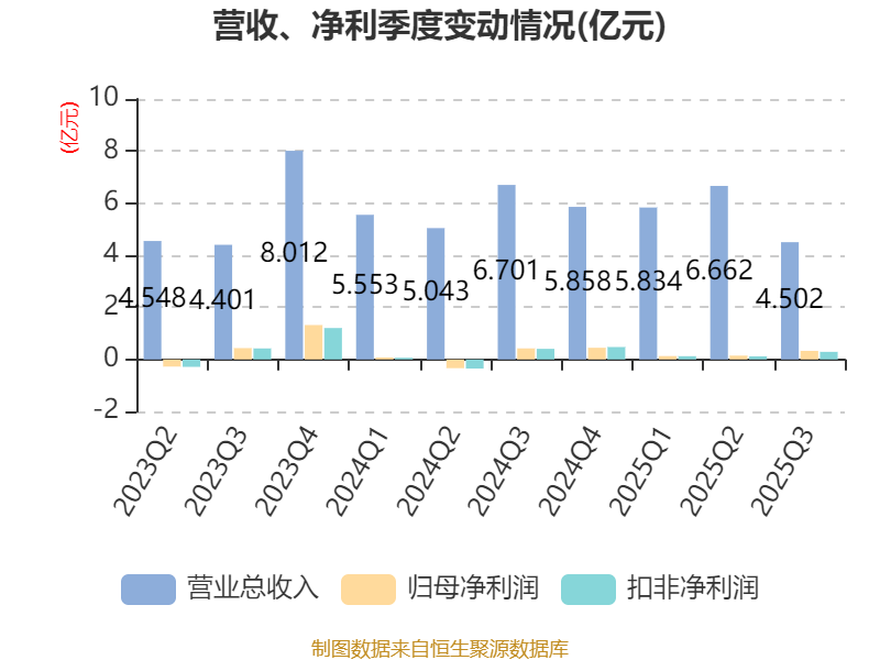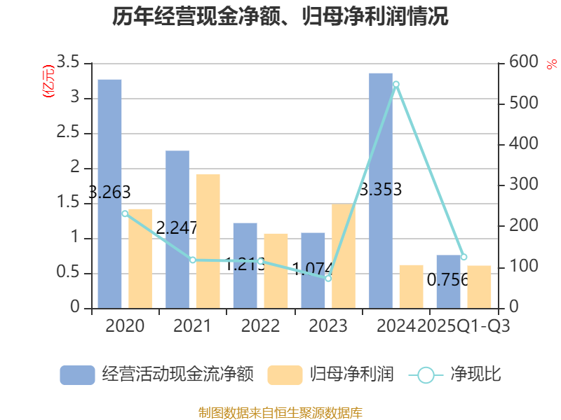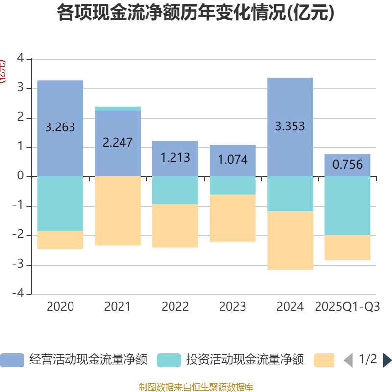 2025年前三季度,公司经营活动现金流净额为7564.35万元,同比下降60.13%;筹资活动现金流净额-8411.22万元,同比增加5379.11万元;投资活动现金流净额-2亿元,上年同期为-7548.28万元。