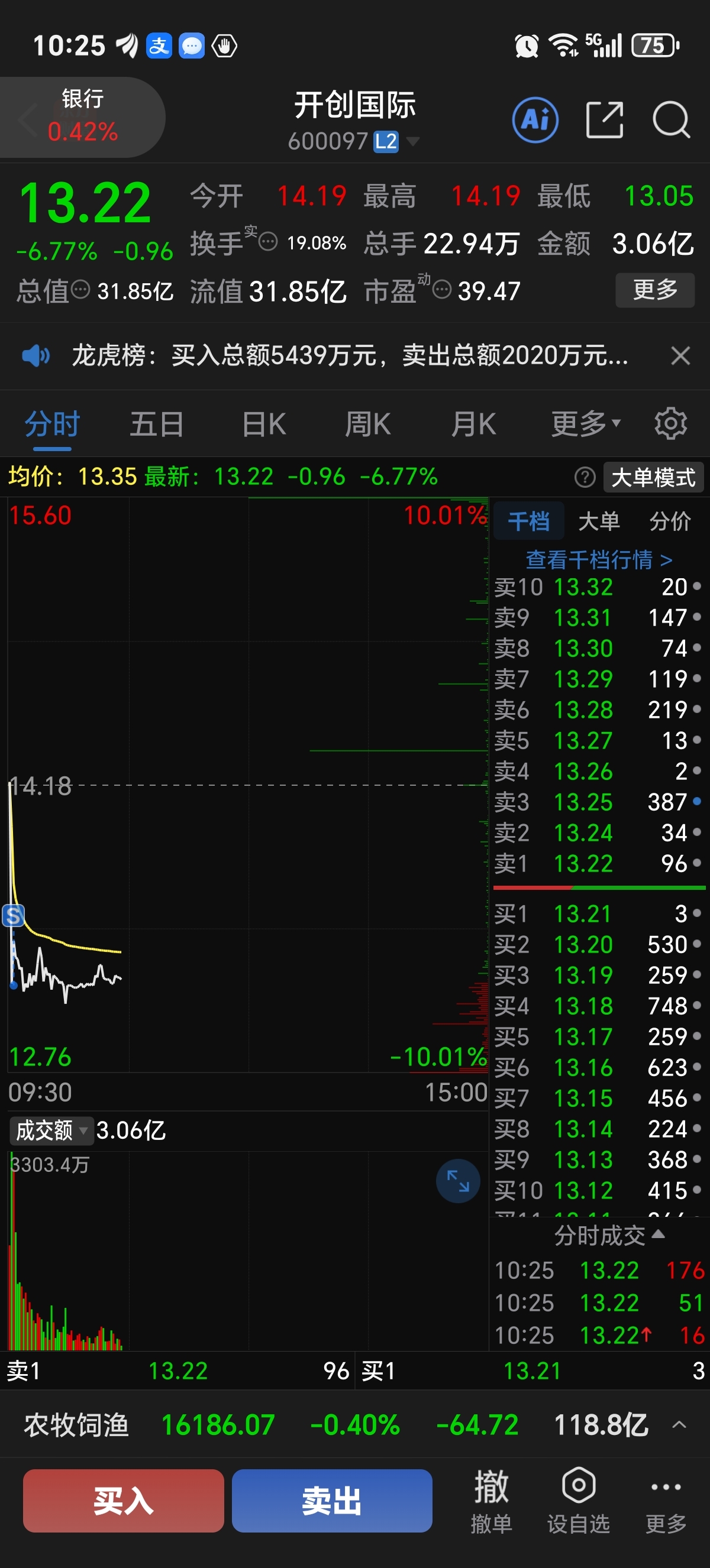 $开创国际(SH600097)$ 一卖就有立马止跌的功效