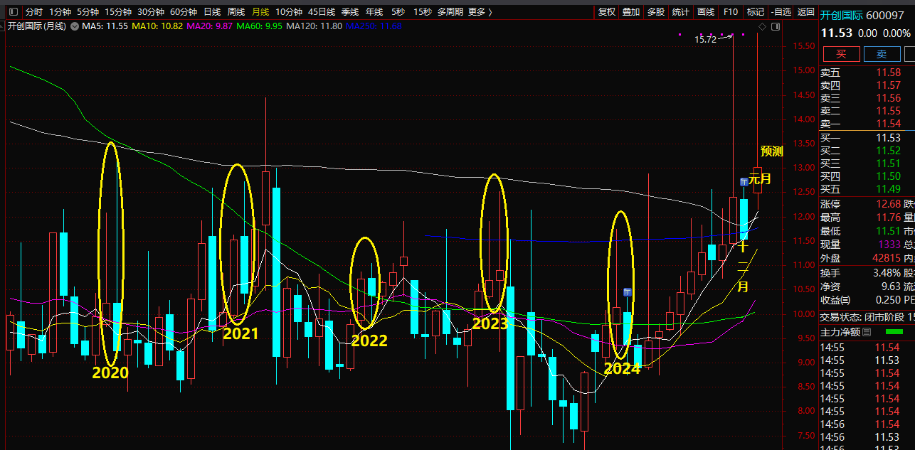 在12月份资金收紧的情况下,开创的月K线都是上涨的,元月份中后期临近春节冲高回落;