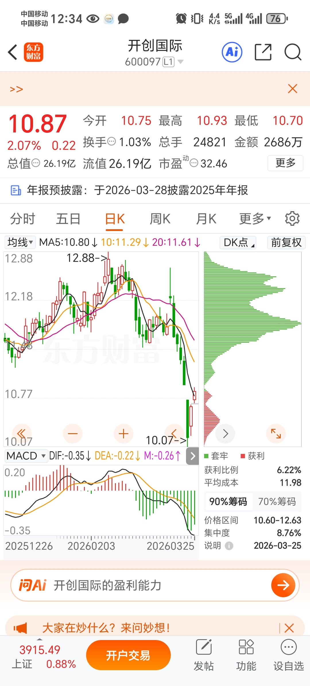 $开创国际(SH600097)$ 根据MACD,下午要大涨,涨停了