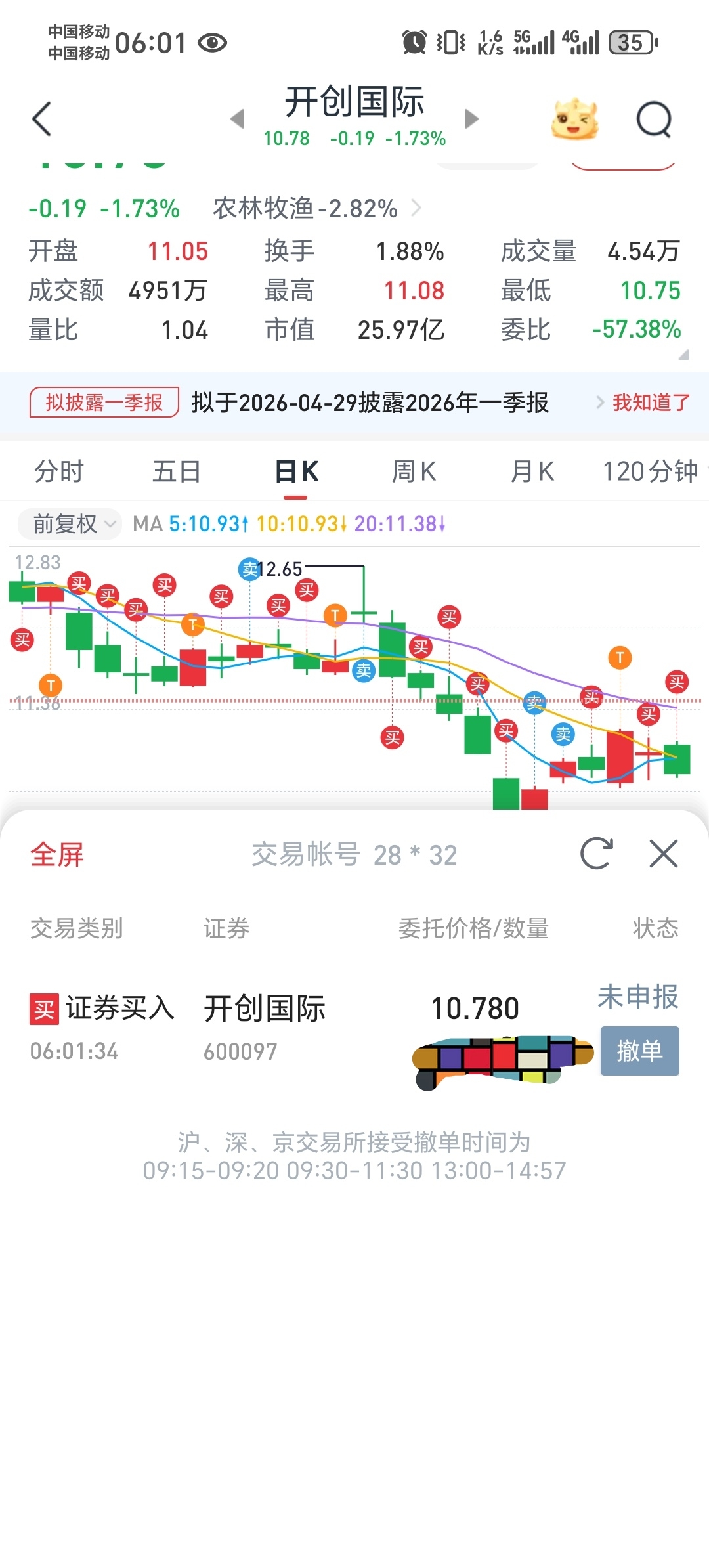 $开创国际(SH600097)$ 今天继续买入,希望今天继续下跌!