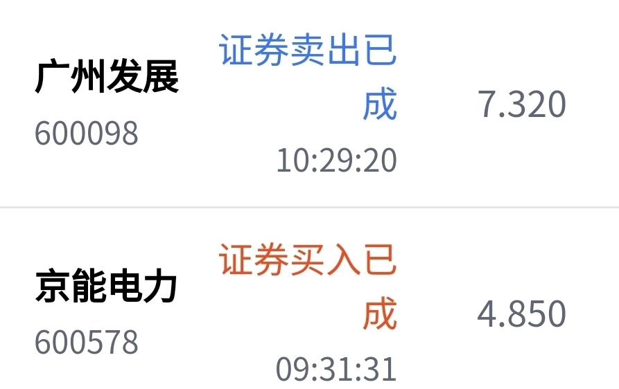 广州发展还不错,胆子小,赚了5%个点撤退,回撤7附近再进去,换了个京能