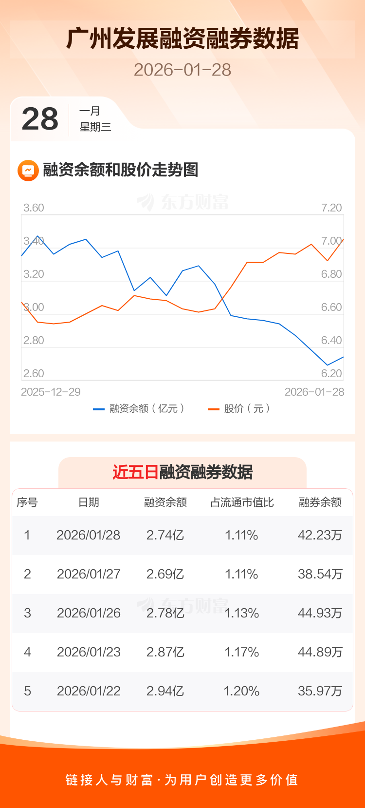 交易所最新数据显示,广州发展于2026年1月28日获融资买入2473.14万元,融资偿还1951.72万元,当日融资净买入521.42万元。目前,该股融资余额2.74亿,占流通市值比例为1.11%。