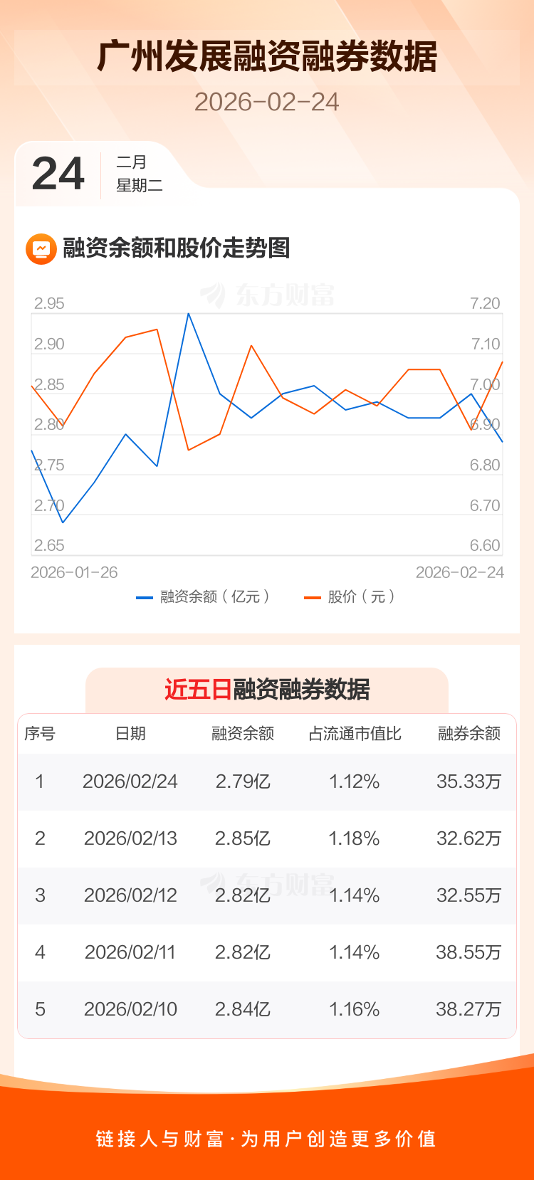 交易所最新数据显示,广州发展于2026年2月24日获融资买入930.69万元,融资偿还1590.62万元,当日融资净偿还659.93万元。目前,该股融资余额2.79亿,占流通市值比例为1.12%。