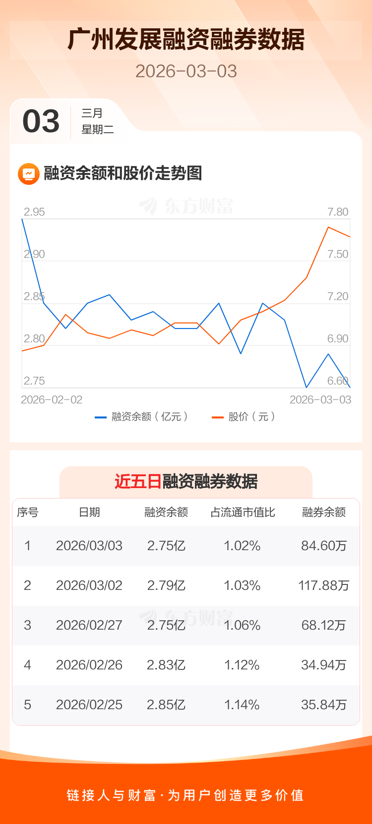交易所最新数据显示,广州发展于2026年3月3日获融资买入3732.07万元,融资偿还4105.99万元,当日融资净偿还373.92万元。目前,该股融资余额2.75亿,占流通市值比例为1.02%。