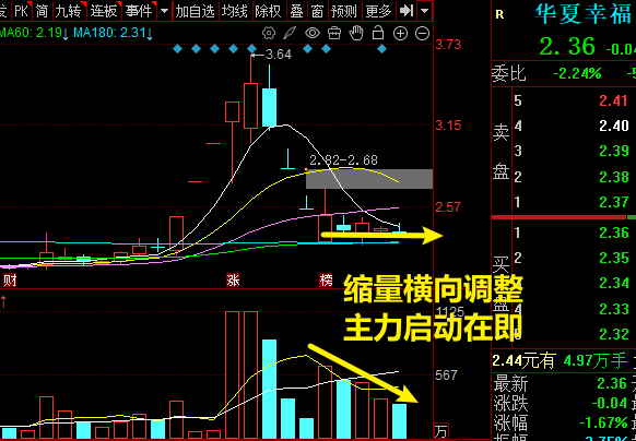 股价连续收出小阴小阳线,成交量缩量,形成标准的量价背离形态,主俚从前期的暴力下跌洗盘,到目前横盘震荡西筹,说明主俚在一步步的收集场内筹马,为后续拉升做准备,目前地量地价,再继续向下调整的空间已然不大,所以需要观察的是明天能否放量收出反包阳并且从新站上五日均线,如果两个条件都满足,手中有苍位的铁子可以考虑低西进场。