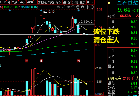 今天股价跌破位了,早盘股价低开向下走调整的过程中,我在9.7的位置全部止损离场了,从短线的角度来看,兰石里面的主俚属于弱庄,接下来向下洗盘的时间会比较长,所以没有必要把紫金耗死在里面,我的策略是离场之后继续观察,什么时候地量地价,主俚洗盘结束了再去低西。