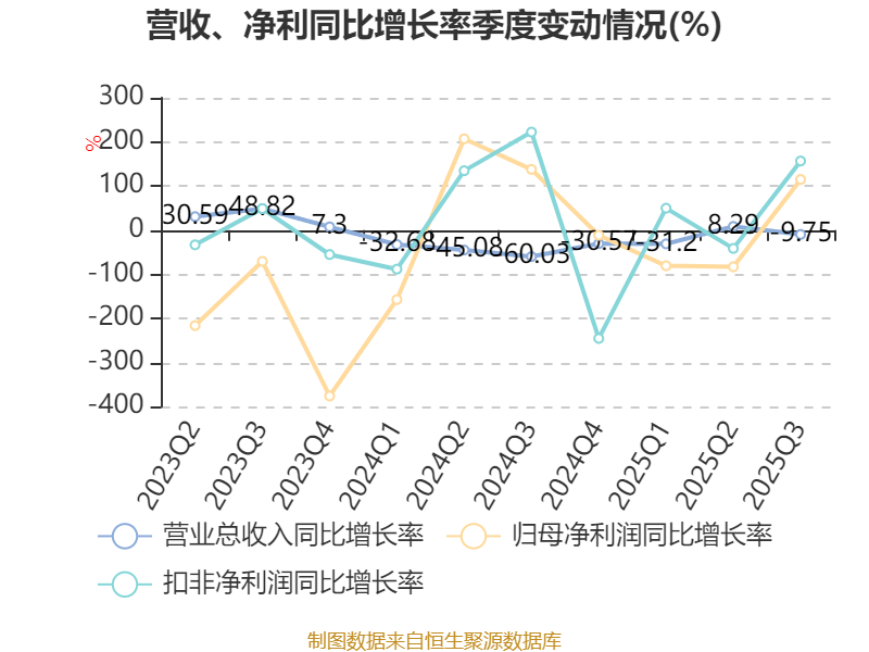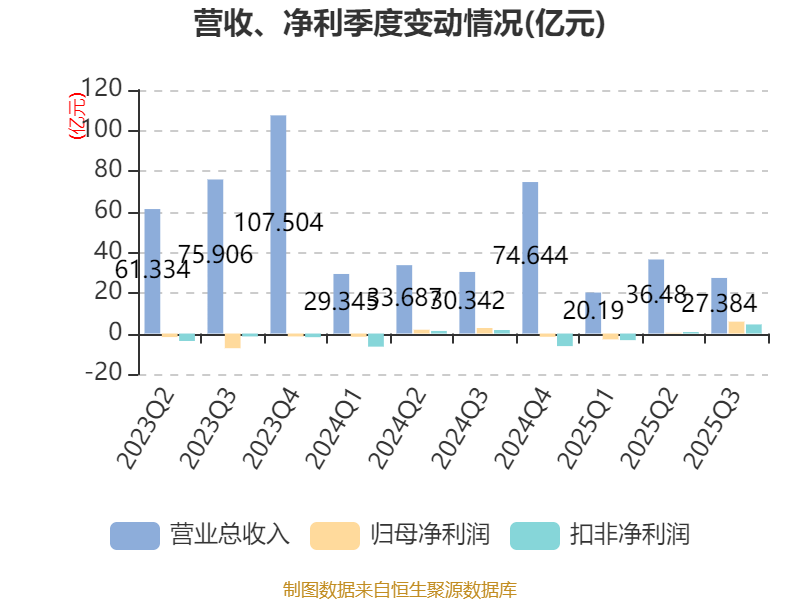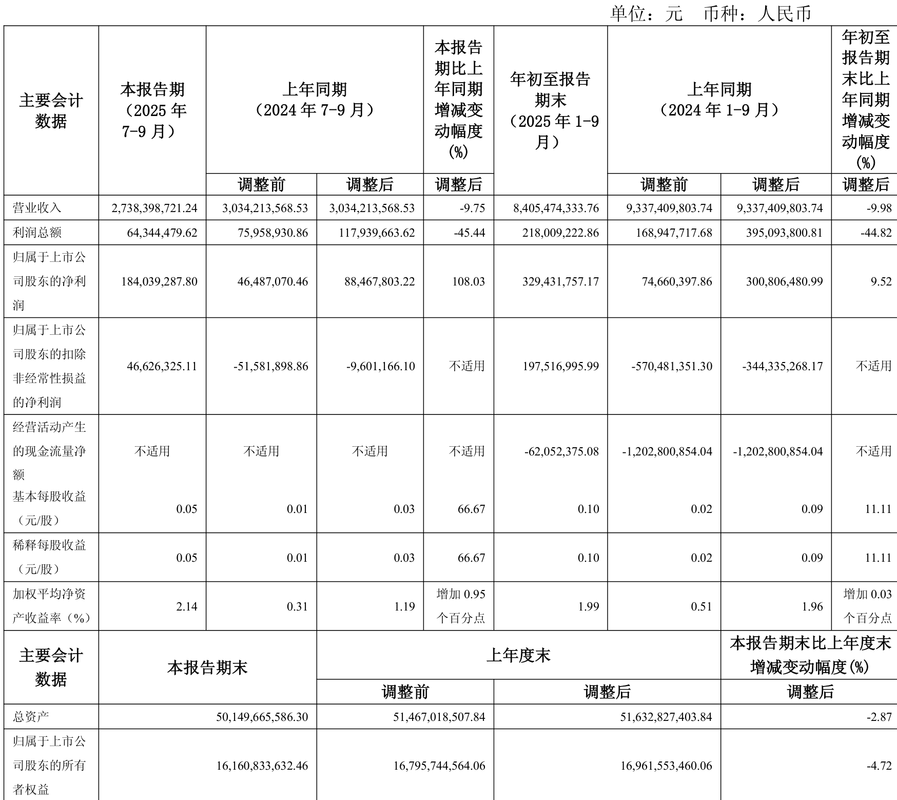 2025年前三季度,公司经营活动现金流净额为-6205.24万元,同比增加11.41亿元;筹资活动现金流净额-9.8亿元,同比增加10.41亿元;投资活动现金流净额10.25亿元,上年同期为10.6亿元。
