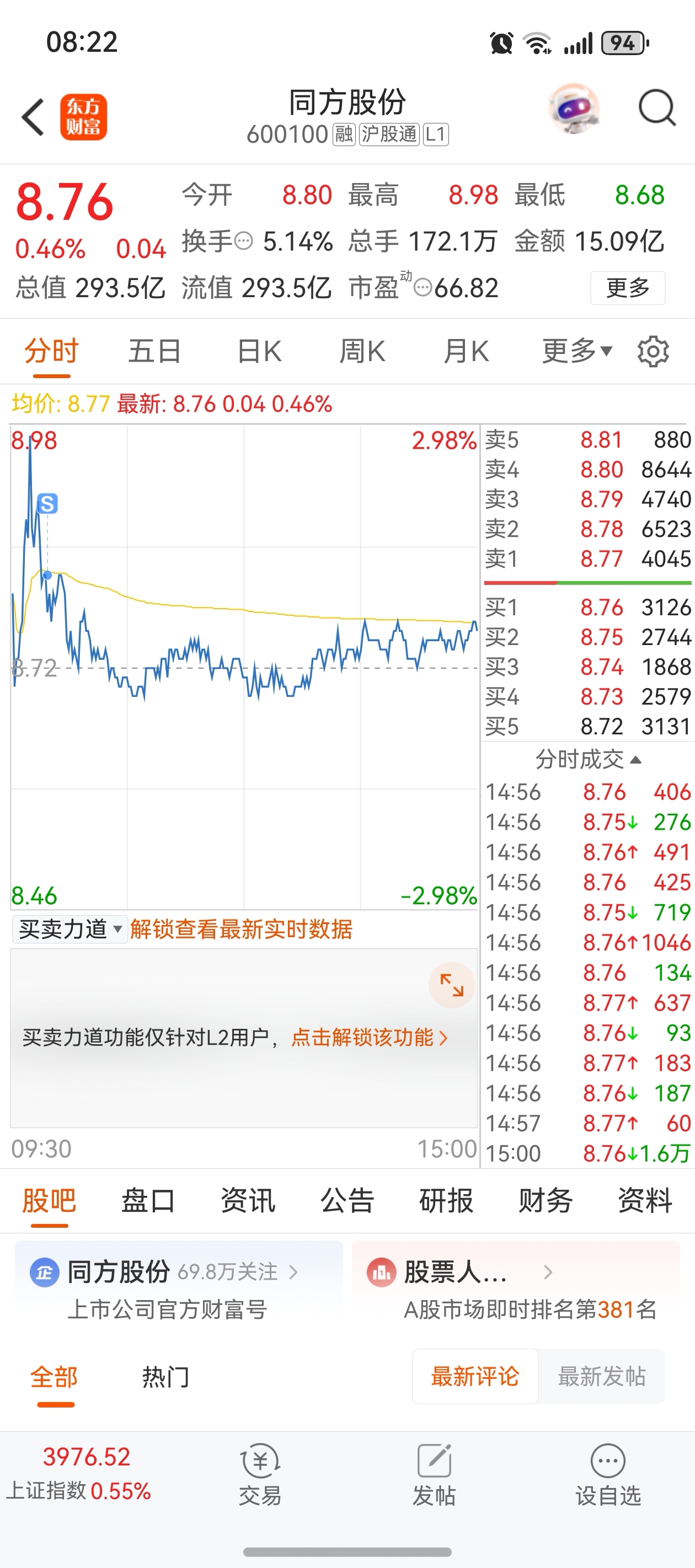 $同方股份(SH600100)$ 8.82清仓走人,回落到8块以下再接回来。