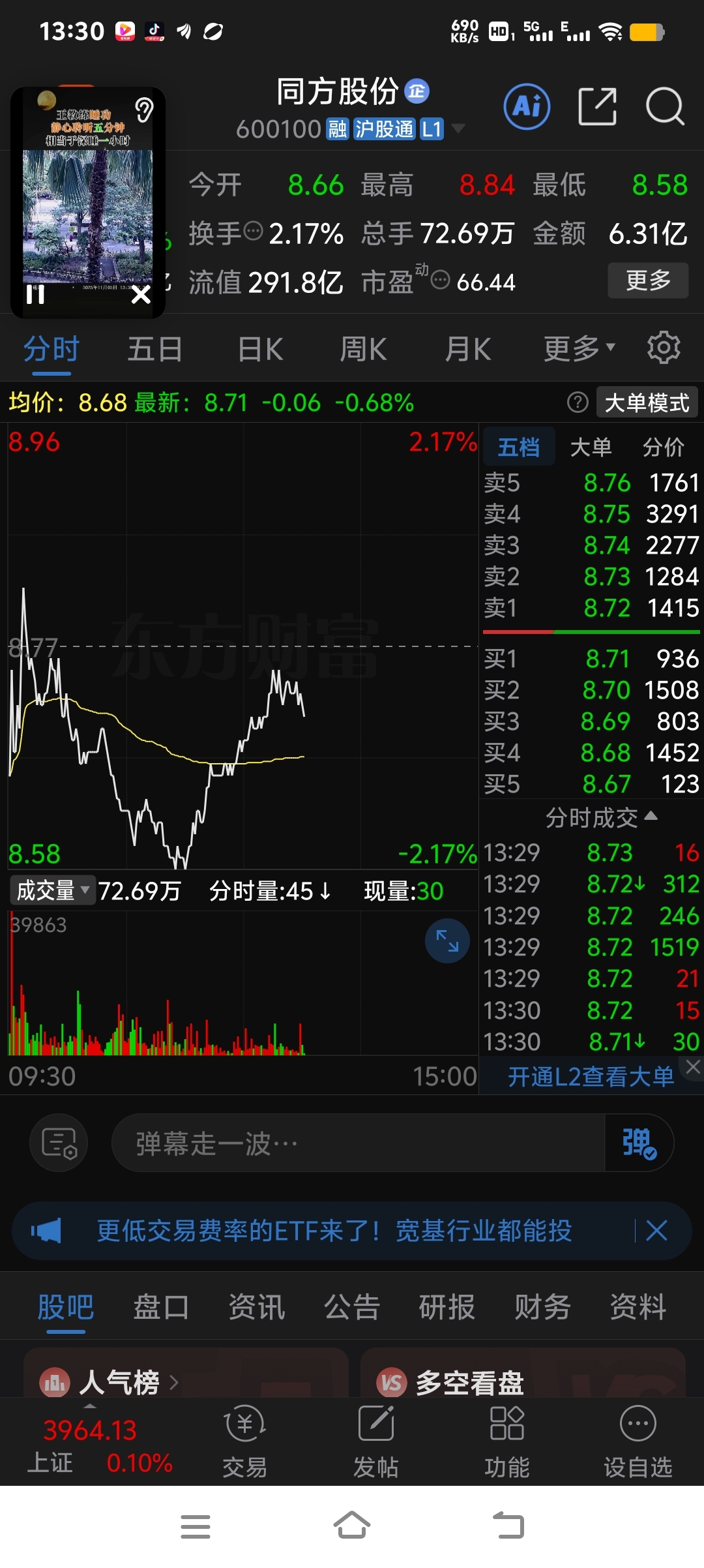 $同方股份(SH600100)$ 主力不想乘大盘普涨而拉高(出货)在吃还是在等什么呢?都触底V字大涨同方不动,俺T回来了!