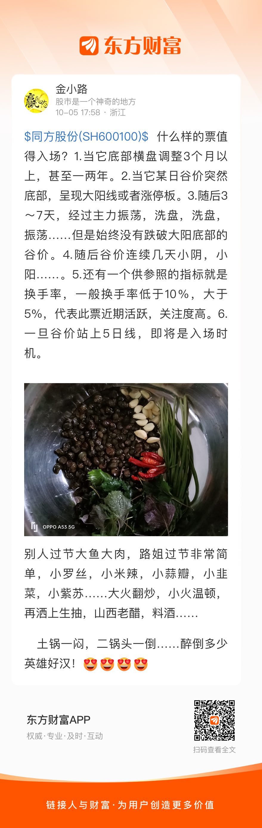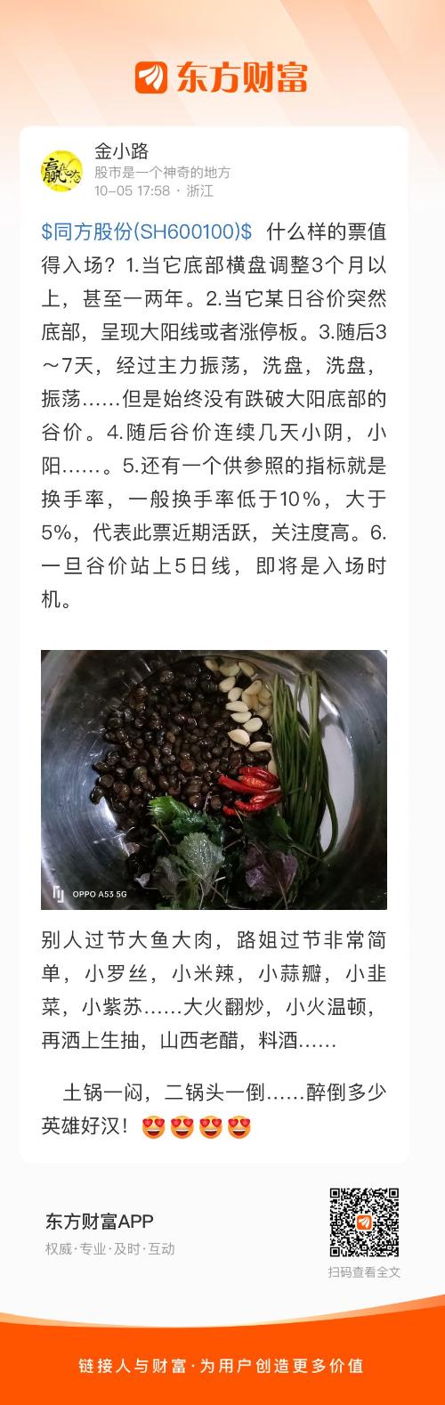 金小路10-05 17:58 · 浙江 已关注【机会涌现 多股待涨】5000点福利券兑换全年Level-2!同方股份8.60-2.49%$同方股份(SH600100)$ 什么样的票值得入场?1.当它底部横盘调整3个月以上,甚至一两年。2.当它某日谷价突然底部,呈现大阳线或者涨停板。3.随后3~7天,经过主力振荡,洗盘,洗盘,振荡……但是始终没有跌破大阳底部的谷价。4.随后谷价连续几天小阴,小阳……。5.还有一个供参照的指标就是换手率,一般换手率低于10%,大于5%,代表此票近期活跃,关注度高。6.一旦谷价站上5日线,即将是入场时机。别人过节大鱼大肉,路姐过节非常简单,小罗丝,小米辣,小蒜瓣,小韭菜,小紫苏……大火翻炒,小火温顿,再洒上生抽,山西老醋,料酒…… 土锅一闷,二锅头一倒……醉倒多少英雄好汉!色色色色发布于同方股份吧东方财富Android版分享至:微信朋友圈微博郑重声明:用户在社区发表的所有信息将由本网站记录保存,仅代表个人观点,与本网站无关,不对您构成任何投资建议,据此操作风险自担。请勿相信代客理财、免费荐股和炒股培训等宣传内容,远离非法证券活动。请勿添加发言用户的手机号码、公众号、微博、微信及QQ等信息,谨防上当受骗!