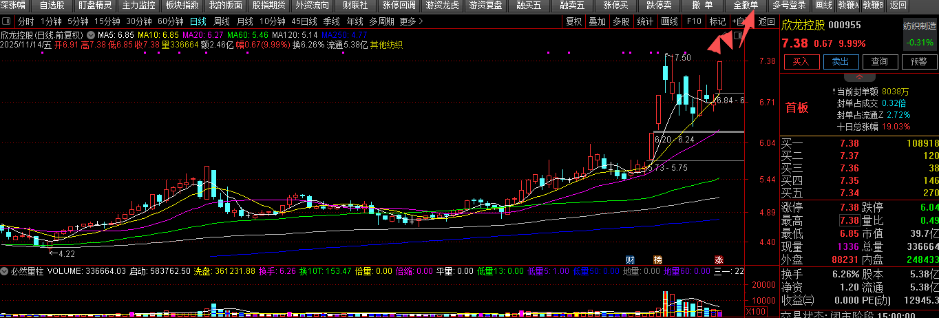 龙哥排队孚日新能连续两天了,门缝都没见过一次,自然不甘心。周末军军概念发酵,而孚日股份也有军民融合概念,叠加名字特别“浮日”,识别度极高。此外,技术形态上,从走势看,月周日都在加速中。从日线级别看,十月中下旬吃货明显。目前是第一次爆量后的加速,从筹码分布看,下方筹码没动,顶格筹也没动,所以如果今日有开门机会,登门做客,应该还有收获。