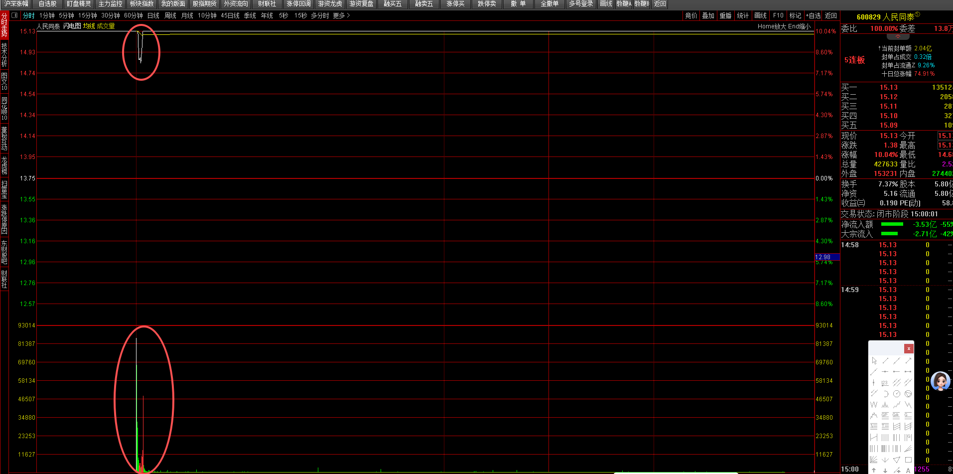 上周龙哥把人民同泰放在首位,当然是比较看好。首先名字特别,识别度高,且有寓意。技术形态上,也是月线级别低位,周线、日线级别主升浪,当前是主L吃饱后的第一次拉升,还是比较安全。从筹分布看,下方的筹还没动静,主L没跑。从连板看,距离七板还有两个;从时间节点看,合富停三天,因此,人民通泰可以多玩两到三天。下图是周五早盘分时短暂分歧后封板留影。