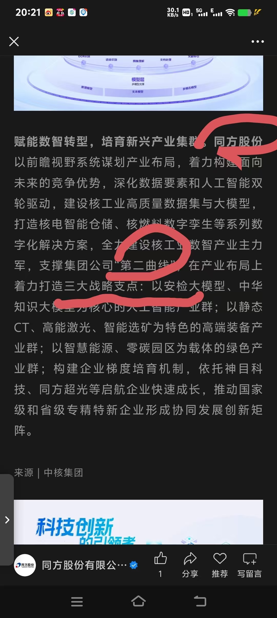 十五五的同方承诺:在产业布局上着力打造三大战略支点:以安检大模型、中华知识大模型为核心的人工智能产业群;以静态CT、高能激光、智能选矿为特色的高端装备产业群;以智慧能源、零碳园区为载体的绿色产业群;构建企业梯度培育机制,依托神目科技、同方超光等启航企业快速成长,推动国家级和省级专精特新企业形成协同发展创新矩阵。三群+