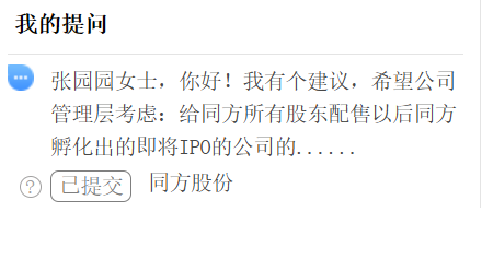 昨天我已经向董秘提交了向股东配售孵化ipo企业原始股的建议,不知道会不会回复。大家都去提建议,或许他们会不得不回应。