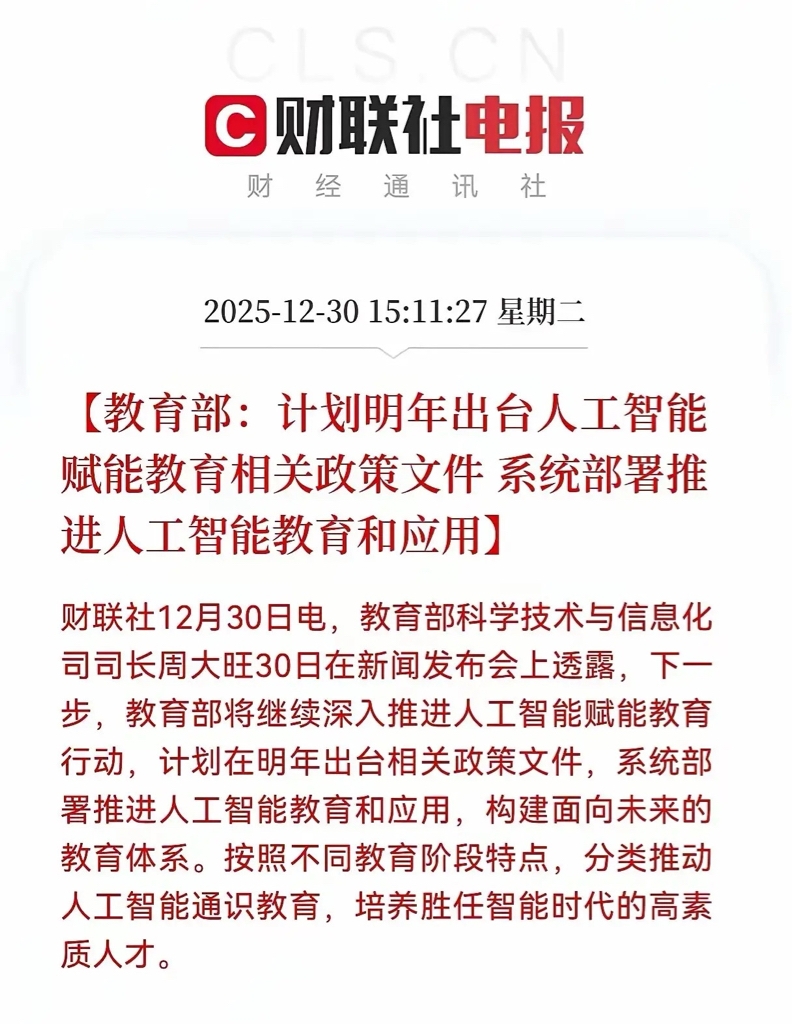 $同方股份(SH600100)$ 同方股份因其在教育全学段的数字化产品布局、独有的学术数据资源以及“华知大模型”等技术能力,与2026年将出台的AI教育政策方向高度吻合,属于明确的受益标的。