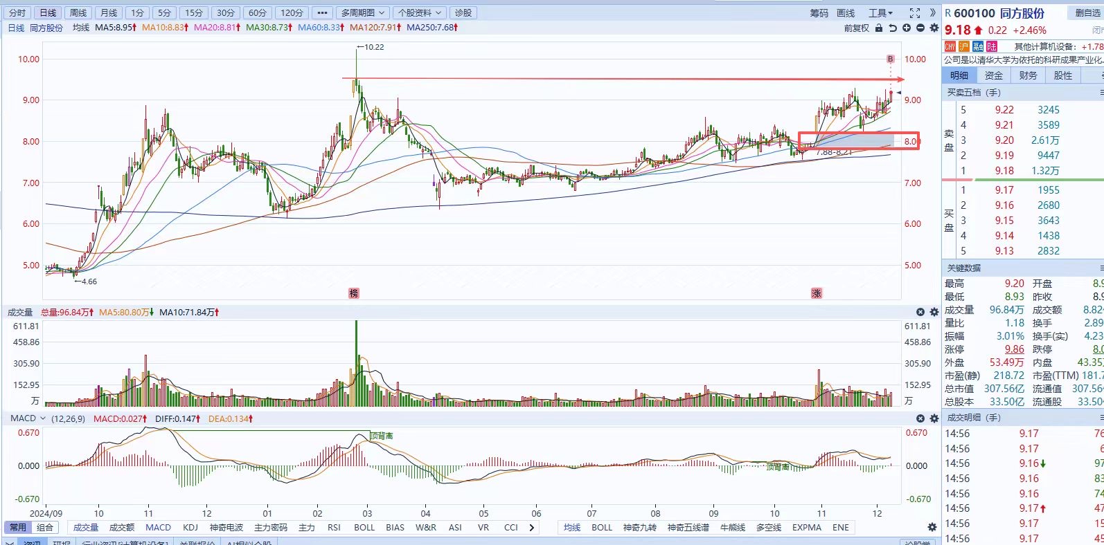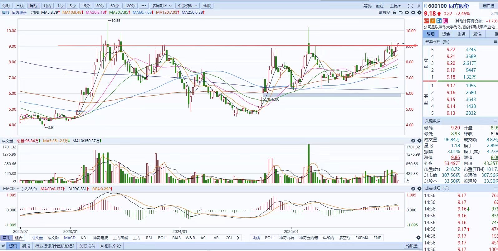 $同方股份(SH600100)$ AI+的炒作还在延续,但是有业绩支撑的公司不多,从周线看,是第五次冲击区间高点,日线图看,已持续调整10个月,看看最近能不能给中大阳突破平台了