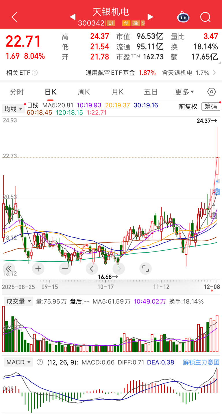十二月份开局除了商业航天和海峡题材,其他概念轮动非常快,而商业航天就像去年8月份的人形机器人一样,大多数人都不看他能成为主线,但它从10月底开始,不知不觉也炒作了一个多月了,最近利好消息越来越多,所以我从$上海沪工(SH603131)$ 做了高低切,去了$天银机电(SZ300342)$ 并且昨天把仓位降低了