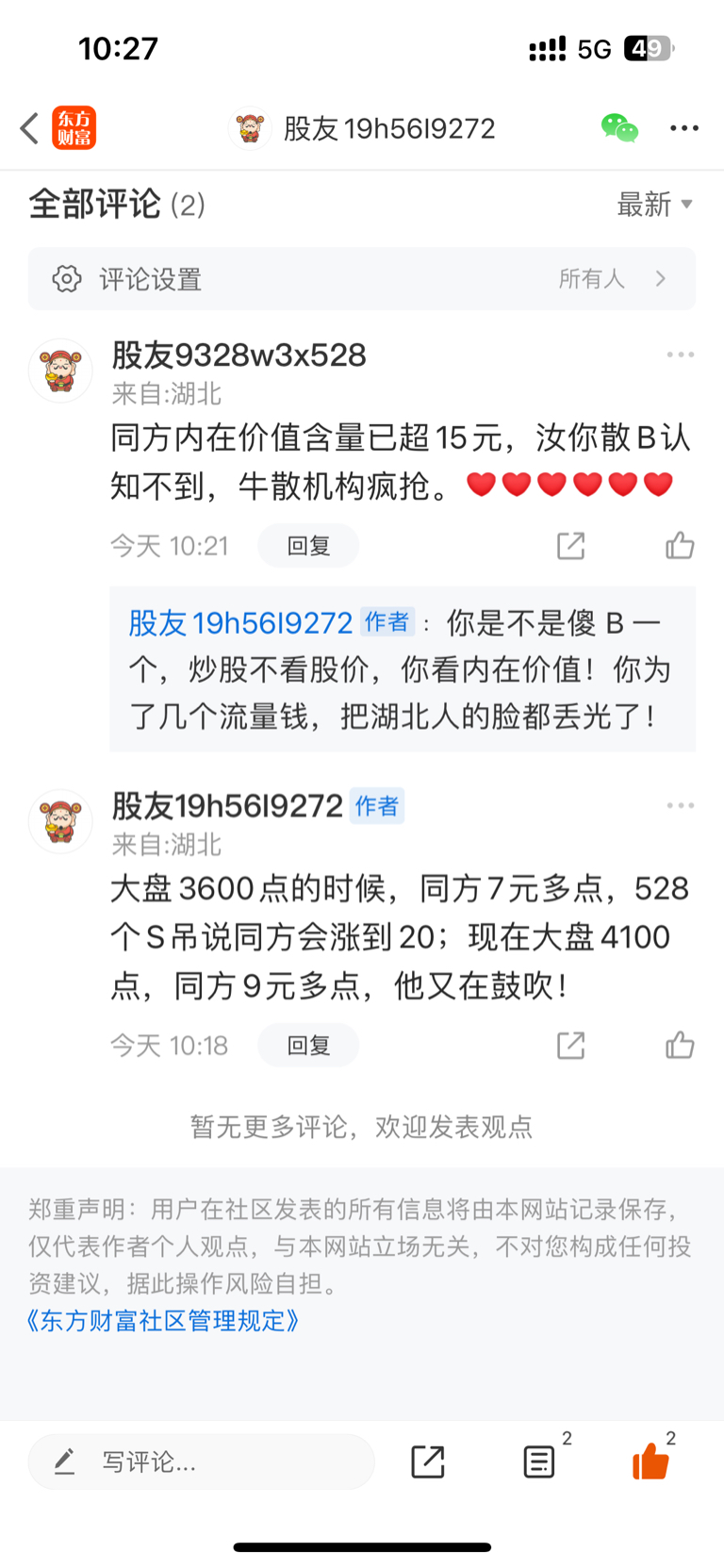 温馨提示: 1.根据《证券法》规定,禁止编造、传播虚假信息或者误导性信息,扰乱证券市场;2.用户在本社区发表的所有资料、言论等仅代表个人观点,与本网站立场无关,不对您构成任何投资建议。用户应基于自己的独立判断,自行决定证券投资并承担相应风险。《东方财富社区管理规定》