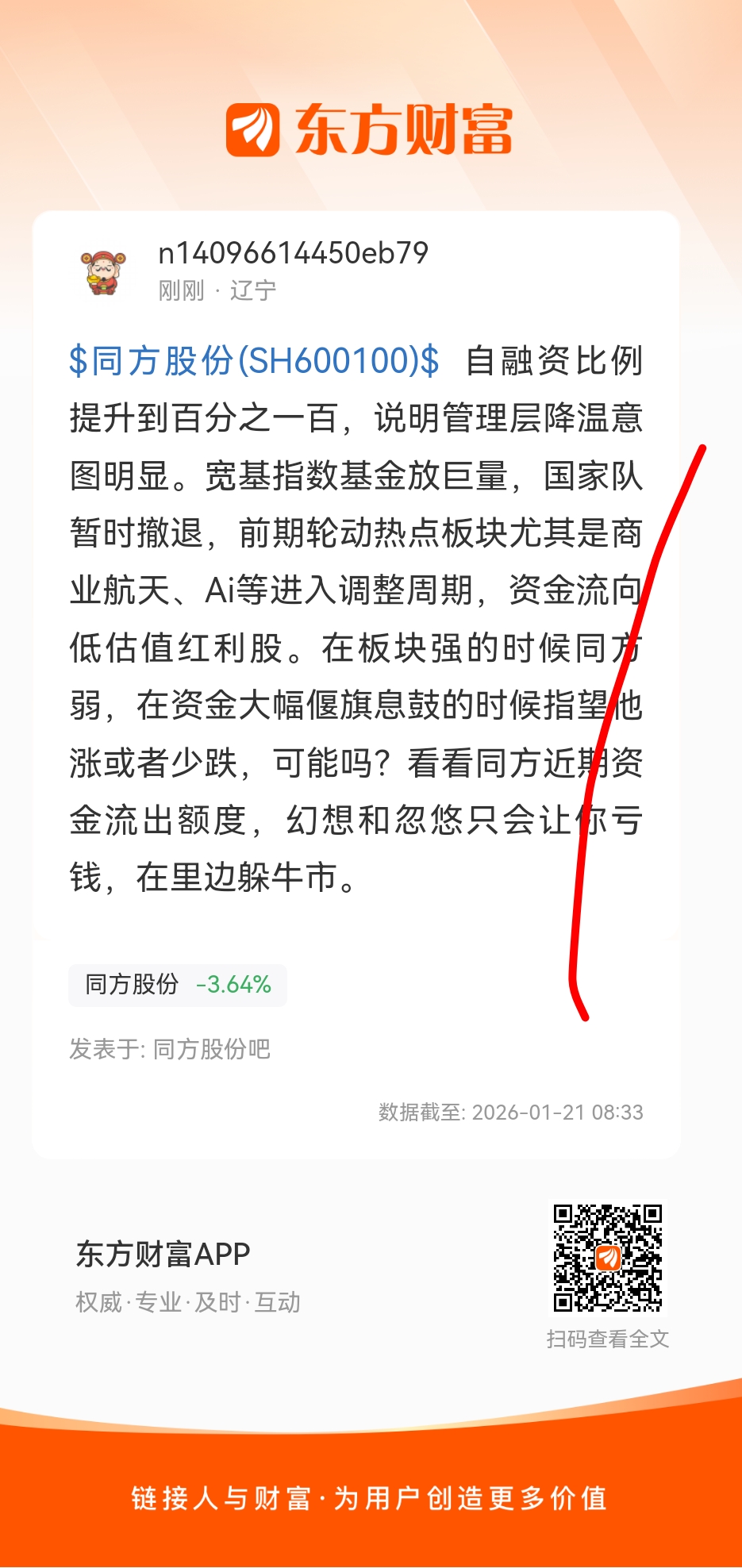$同方股份(SH600100)$ 自融资比例提升到百分之一百,说明管理层降温意图明显。宽基指数基金放巨量,国家队暂时撤退,前期轮动热点板块尤其是商业航天、Ai等进入调整周期,资金流向低估值红利股。在板块强的时候同方弱,在资金大幅偃旗息鼓的时候指望他涨或者少跌,可能吗?看看同方近期资金流出额度,幻想和忽悠只会让你亏钱,在里边躲牛市。