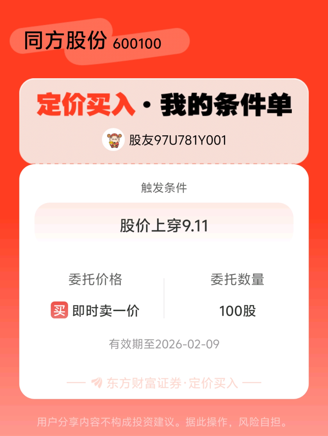 #条件单交流# #定价买入晒单# 一位股神设置了一个定价买入条件单,接下来就是见证奇迹的时刻~$同方股份(SH600100)$