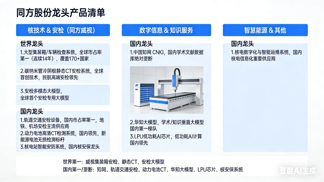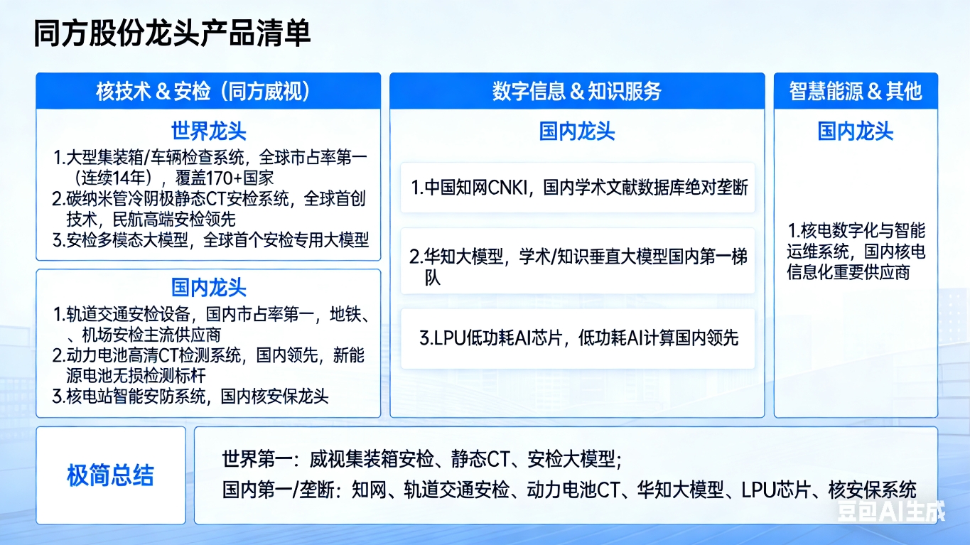 国内第一/垄断: 知网、轨道交通安检、动力电池CT、华知大模型、LPU芯片、核安保系统。