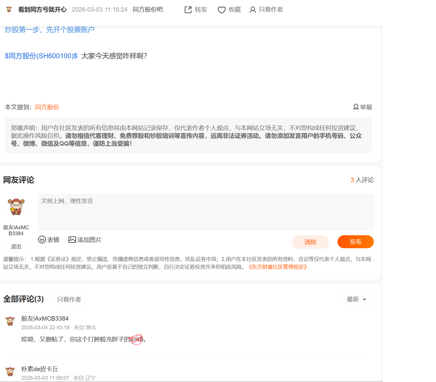 温馨提示: 1.根据《证券法》规定,禁止编造、传播虚假信息或者误导性信息,扰乱证券市场;2.用户在本社区发表的所有资料、言论等仅代表个人观点,与本网站立场无关,不对您构成任何投资建议。用户应基于自己的独立判断,自行决定证券投资并承担相应风险。《东方财富社区管理规定》
