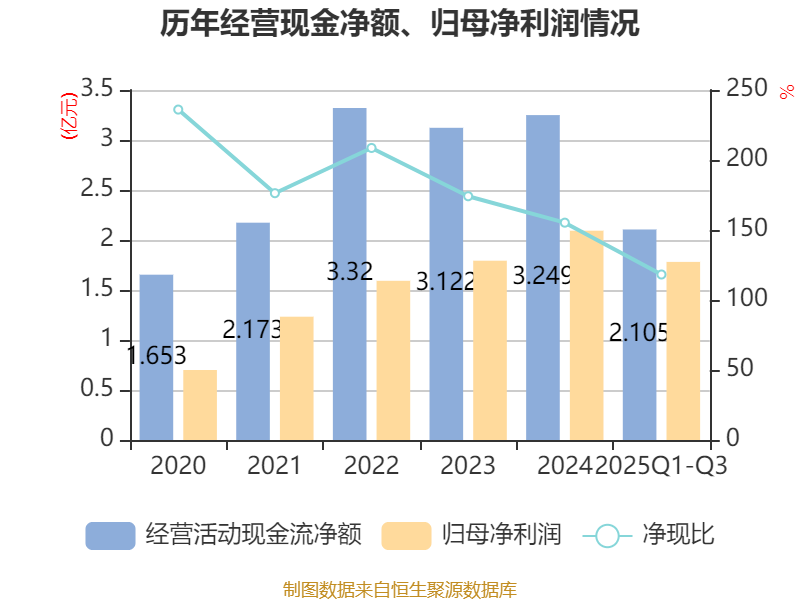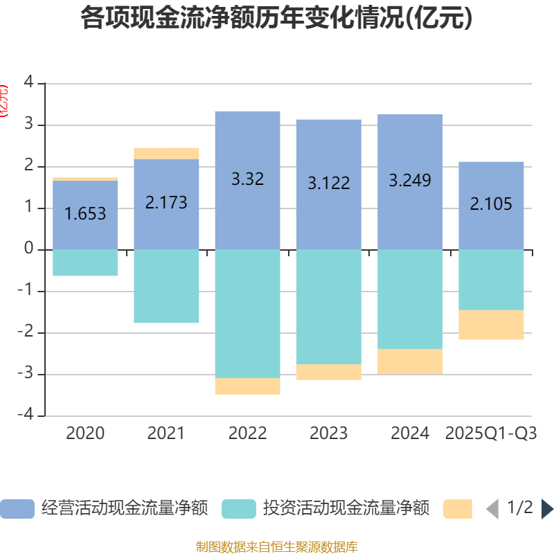 2025年前三季度,公司经营活动现金流净额为2.11亿元,同比下降50%;筹资活动现金流净额-7078.43万元,同比减少2419.72万元;投资活动现金流净额-1.46亿元,上年同期为-1.91亿元。