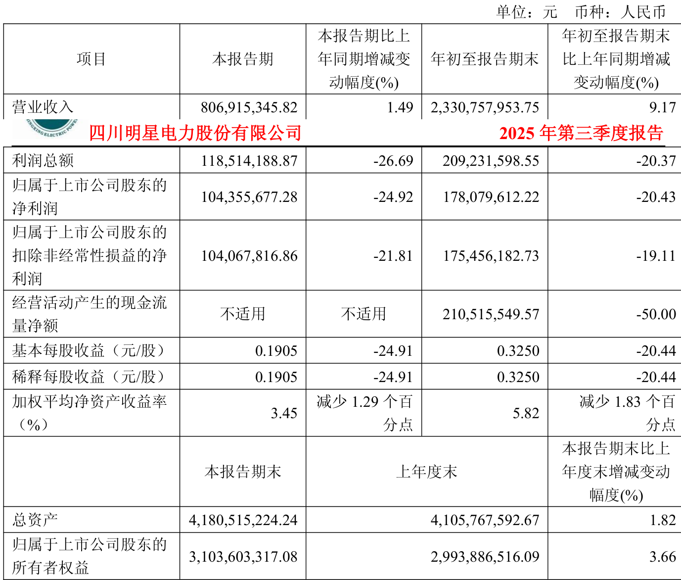 中证智能财讯明星电力(600101)10月30日披露2025年第三季度报告。前三季度公司实现营业总收入23.31亿元,同比增长9.17%;归母净利润1.78亿元,同比下降20.43%;扣非净利润1.75亿元,同比下降19.11%;经营活动产生的现金流量净额为2.11亿元,同比下降50.00%;报告期内,明星电力基本每股收益为0.325元,加权平均净资产收益率为5.82%。