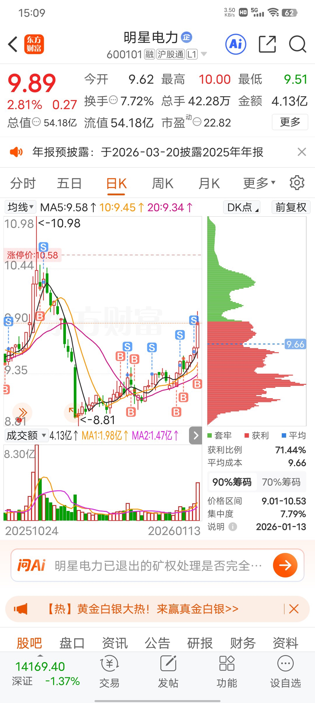 $明星电力(SH600101)$ 捡了芝麻丢了饼,早上本来要接回的最后又成高位接