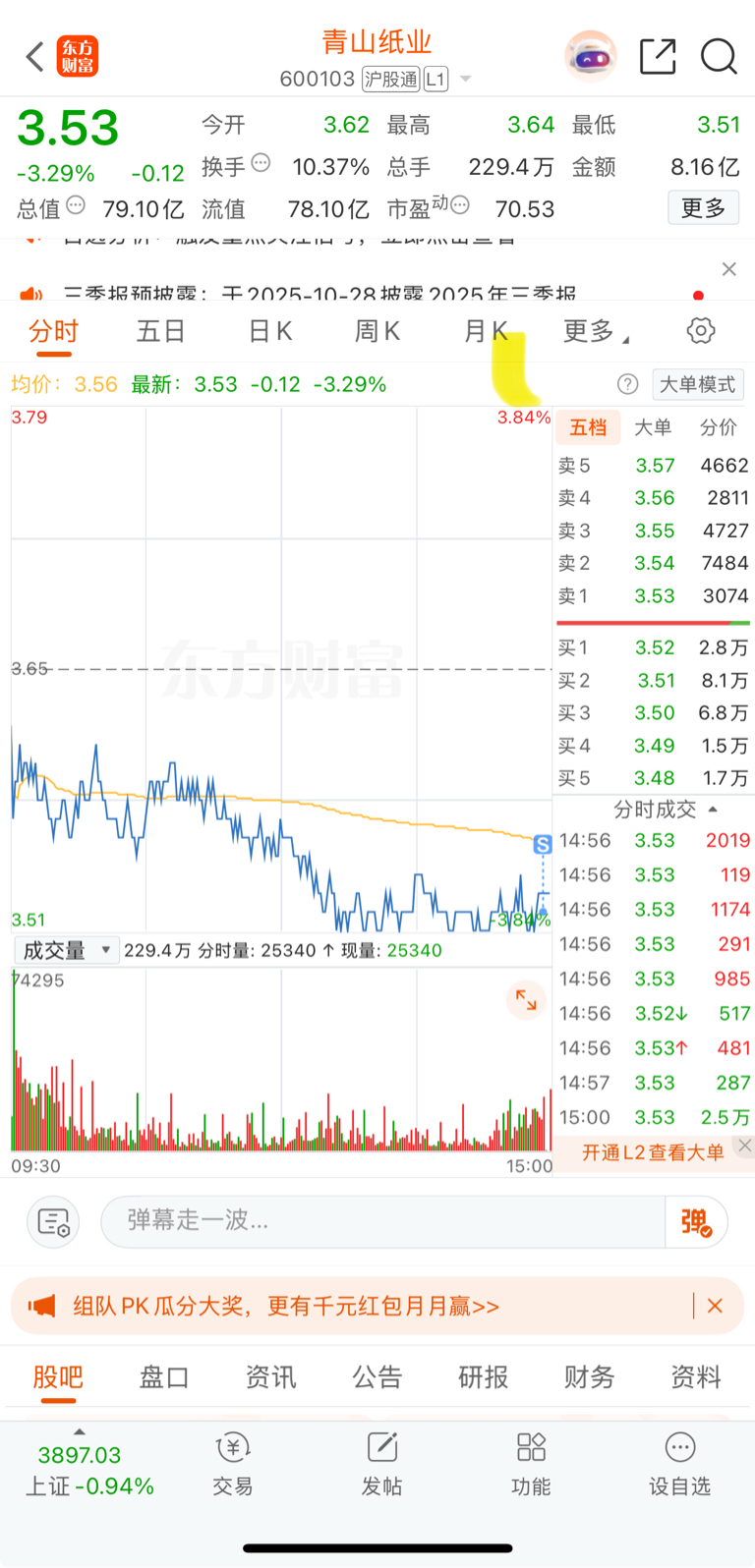 $青山纸业(SH600103)$ 尾盘砸了,3.3左右再考虑建仓。
