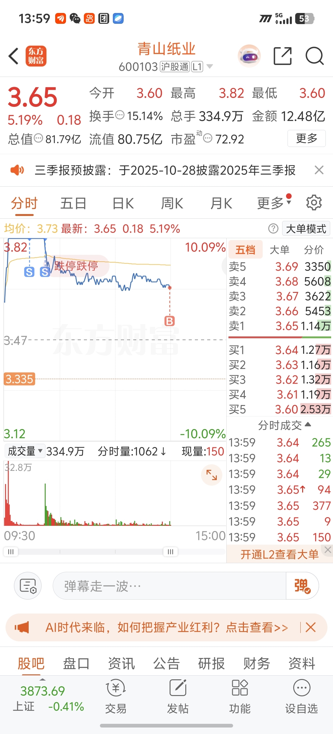 $青山纸业(SH600103)$ 今天接回来一半明天再接回来一半